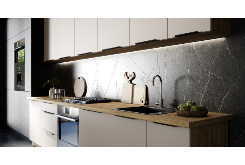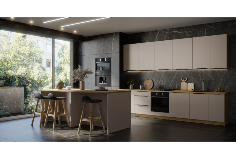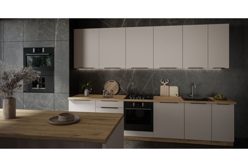- Fronty szafek - płyta 16mm w kolorze cashmere, obrzeże to PCV 1mm